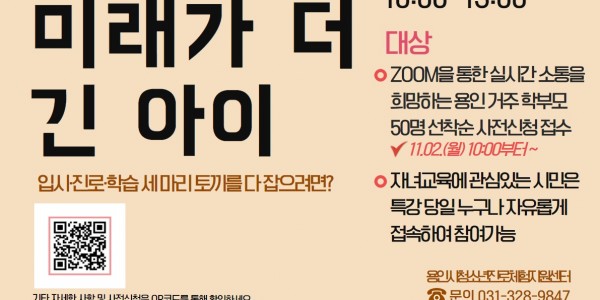 (재)용인시청소년미래재단(이사장 백군기) 용인시청소년진로체험지원센터는 아름다운배움 부설 행복한공부연구소 박재원 소장을 초청하여 ‘과거가 더 긴 부모, 미래가 더 긴 아이’를 주제로 부모교육 특강을 진행한다. 이번 부모교육 특강은 2020년 제1회 랜선 진로진학 레시피 프로그램으로 오는 11월 12일 목요일 10시에 유튜브 용인시청소년미래재단 채널에서 실시간 생중계 된다. 이번 부모교육 특강을 통해 입시·진로·학습…
