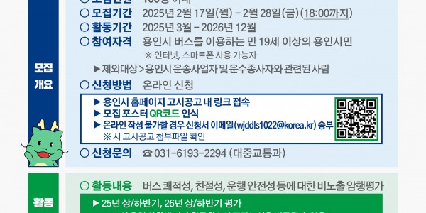 용인특례시(시장 이상일)는 17일부터 28일까지 시민이 직접 버스에 타보고 평가하는 ‘버스고고’ 시민평가단 100명을 모집한다. 시민평가단은 3월부터 내년까지 상반기와 하반기에 걸쳐 각자 배정된 노선에 탑승해 ▲쾌적성 ▲안정성 ▲기사의 친절성 등 버스 서비스를 평가한다. 시민평가단은 용인에 거주하고 있는 19세 이상의 시민이라면 누구나 지원할 수 있다. 다만 운송사업 종사자나 시민평가단의 취지에 부합하지 않는 지원자…