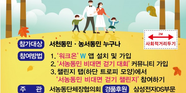 용인시 기흥구 서농동은 서농동단체장협의회에서 코로나19로 지쳐있는 지역 주민의 몸과 마음에 활력을 되찾을 수 있도록 10월 31일 비대면 걷기 행사를 개최한다고 밝혔다. 이번 행사는 생활 속 거리두기의 기본수칙을 지키면서 온라인 앱을 통해 진행될 예정이다. 서농동민이면 누구나 플레이스토어 또는 앱스토어에서 ‘워크온’앱을 설치 후, ‘서농동민 비대면 걷기 대회 커뮤니티’가입, 챌린지 화면에서 개별 참가를 신청하고 행사…