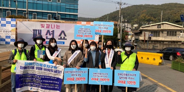 용인시 처인구는 지난 10월 27일(화) 처인구청 정문 및 용인중앙시장 일대에서 장애인전용 주차구역에 대한 인식 개선 및 위반활동 방지를 위한 캠페인을 실시하였다. 이번 캠페인은 코로나19로 인한 방역수칙을 준수하며 사회복지과 직원과 희망일자리 사업 근로자가 함께 참여하였다. 시민을 대상으로 전단지 물티슈 등 홍보물품을 배부하고 피켓홍보, 현수막 등을 게시하며 진행하였다. 구청 관계자는 “이번 캠페인으로 장애…
