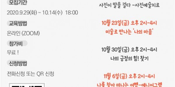 용인시 정신건강복지센터는 청년의 우울, 불안, 스트레스 해결을 돕기 위한 정신건강교육 「청년 마음 지킴이 프로젝트」를 운영할 계획이라고 밝혔다. 「청년 마음 지킴이 프로젝트」는 사진 예술치료, 미술로 만나는 나의 마음, 나의 긍정의 힘 찾기, 에니어그램, 쓸만한 심리학 등 다양한 프로그램으로 구성하였다. 용인시에 거주하는 만 19세~34세 이하 청년이라면 누구나 무료로 참여할 수 있다. 이 프로그램은 오는…