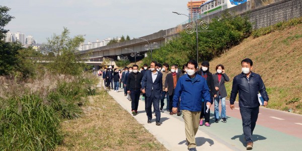 백군기 용인시장은 15일 기흥구 주민으로 구성된 시민감시단과 신갈천~상하천 4km구간을 함께 걸으며 산책로와 자전거도로 등의 시설물을 점검하고 주민 불편사항을 논의했다. 이 자리엔 백 시장을 비롯해 김기준 용인시의회 의장, 김운봉‧이은경 의원, 시민감시단, 이정표 구청장 등 구 관계자 등 25명이 참석했다. 시민감시단은 하천수 역류로 인한 악취, 하천 산책로와 자전거도로 분리, 자전거거치대와 연결계단 설치 등의 불편…