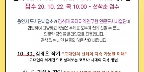 용인시는 도서관과 경희대 국제지역연구원의 협업으로 진행되는 온라인 인문학 강연에 참가할 수강생을 22일부터 모집한다고 밝혔다. 강연은 30일부터 11월 20일까지 4주간 금요일마다 용인시 도서관 유튜브 채널 실시간 스트리밍을 통해 진행된다. 구체적으로 30일엔 김경은 작가의 ‘고대인의 신화와 지속 가능한 미래’, 11월6일엔 김희숙 작가의 ‘코로나 시대의 고전 다시 읽기’, 11월13일엔 조이스 박 작가의 ‘동화에 …