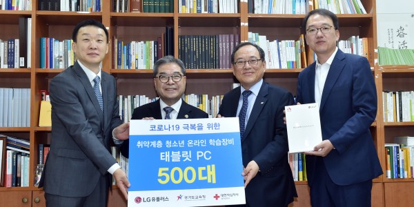 경기도교육청(교육감 이재정)이 LG U+(공공영업담당사장 정재영)로부터 스마트기기를 기탁받아 18일 기증식을 가졌다. LG U+가 대한적십자사 경기지사(회장 윤신일)를 통해 경기도교육청에 4월 말 지정 기탁한 스마트기기는 5천 6백만 원 상당의 태블릿PC 500대 분량이며, 코로나19로 인한 원격수업 지원용이다. 이 교육감은“코로나19로 짧은 시간에 원격수업을 전면 실시해야 하는 어려운 상황에 기업들의 지원이 큰 힘이 되…
