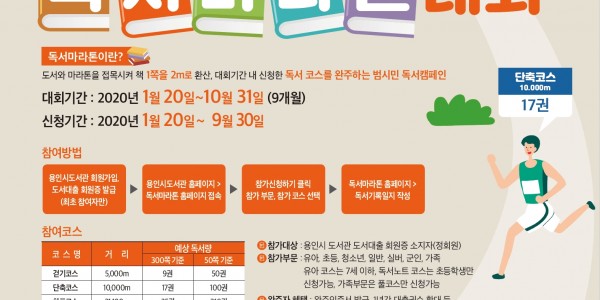 용인시는 시민 스스로 책 읽는 즐거움을 누리고 독서문화를 확산하도록 10월31일까지 열리는 독서마라톤 대회의 참가 신청을 20일부터 접수한다. 올해 4회째 열리는 이 대회는 독서를 마라톤에 비유해 책 1페이지를 2미터로 환산해 완주거리를 계산하는 방식이다. 용인시 도서관 회원이라면 누구나 이 대회에 참여할 수 있다. 참가부문은 유아 ‧ 초등 ‧ 청소년 ‧ 성인 ‧ 실버 ‧ 군인 ‧ 가족 등 7개 부문이다. …