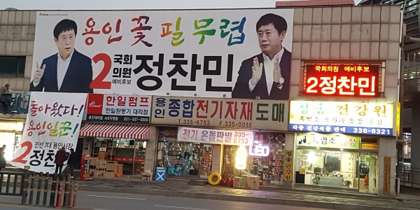 ‘용인꽃 필 무렵, 정찬민’ 자유한국당 용인시갑 지역에서 총선 예비후보로 등록한 정찬민 전 용인시장의 이색 현수막 문구가 눈길을 끌고 있다. 정 전 시장이 처인구 김량장동에 있는 선거사무실 건물 외벽에 내건 현수막은 모두 10개. 건물의 동서남북 모든 방향에 가로 11~16m, 세로 3~6m 짜리 대형 현수막을 내걸어 멀리서도 쉽게 눈에 띌 수 있도록 했다. 현수막에는 ‘돌아왔다! 용인일꾼 정찬민’, ‘용…