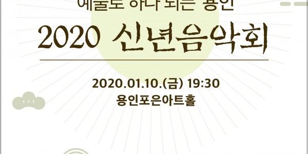 (재)용인문화재단(이사장 백군기)은 2020년(경자년) 새해를 맞아 (이하 )를 1월 10일(금) 오후 7시 30분 용인포은아트홀에서 개최한다. ‘예술로 하나 되는 용인’을 부제로, 용인의 예술인들을 중심으로 진행하는 는 용인의 예술인과 시민이 문화로 소통하는 화합의 장으로 꾸며질 예정이며, 재단은 완성도 높은 공연을 위해 클래식과 대중음악, 전통가락 등 다양한 출연진과 프로그램을 직접 기획, 제작, 연출하는 등 전 …