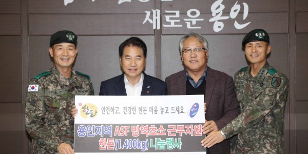 용인시는 19일 한돈협회 용인시지부가 아프리카 돼지열병 차단 방역을 지원한 55사단, 특공연대 등 군부대에 돼지고기 1400kg을 전달했다고 밝혔다. 이날 전달식엔 백군기 용인시장을 비롯해 박동규 55사단 172연대 대령, 김성무 특공연대 대령, 서정용 한돈협회 용인시지부장이 참석했다. 이들 부대는 시가 아프리카돼지열병 차단 방역을 위해 지난 9월28일부터 11월11일까지 거점소독시설 3곳과 79개 농장통제초소를 운…