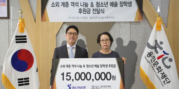 (재)용인문화재단(이사장 백군기)은 경수고속도로 주식회사(대표이사 박종혁/이하 경수고속도로)와 함께 객석 문화 나눔을 위한 후원금 1천만 원과 ‘용인청소년예술꿈드림’ 사업 장학금 5백만 원 등 총 1천 5백만 원의 후원금 전달식을 6월 27일(목) 용인포은아트홀에서 진행했다. 용인-서울고속도로를 관리·운영하는 기업인 경수고속도로는 2017년부터 올해까지 매년 꾸준하게 관내 지역 주민의 문화나눔을 위한 기금을 재단에 전달하…
