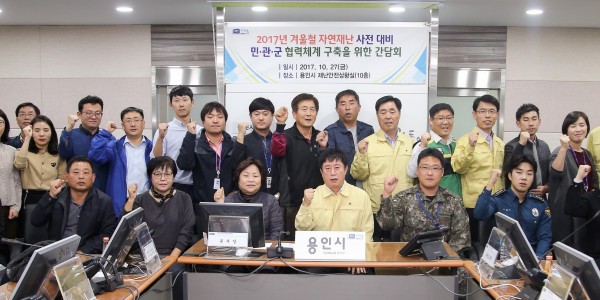 용인시는 27일 시청 재난안전상황실에서 ‘2017년 겨울철 자연재난 사전대비 민·관·군 협력체계를 위한 간담회’를 개최했다고 밝혔다. 이날 간담회엔 용인동·서부경찰서와 용인소방서, 군부대, 용인시 자율방재단 등 15개 기관 관계자들이 참석했다. 참여기관들은 겨울철 폭설, 한파 등 자연재난에 대비해 비상연락망을 정비하고 투입가능한 인력·장비를 사전에 파악해 피해 발생시 신속한 응급복구를 지원하는 등 협력 체계를 구축키…
