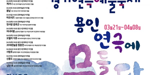 (재)용인문화재단(이사장 정찬민)은 3월 21일부터 4월 8일까지 ‘경기연극예술축제’를 문화예술원 마루홀, 용인시문예회관 처인홀, 용인시여성회관 큰어울마당 등 총 3개 공연장에서 개최한다. 용인문화재단 주최, 한국연극협회 경기도지회 주관으로 개최되는 이번 ‘경기연극예술축제’는 총 15개 연극 공연을 선보이는 축제로 연극을 주제로 한 문화 축제로 펼쳐질 예정이다. ‘경기연극예술축제’는 3월 21일 용인시를 대표하는 극단 …