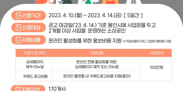 용인특례시(시장 이상일)가 최대 100만원의 온라인 홍보비를 지원받을 관내 소상공인 170명을 10일부터 14일까지 모집한다. 시는 소상공인의 온라인 시장 경쟁력을 강화해 신규 판로를 개척하도록 돕기 위해 올해 처음으로 ‘소상공인 온라인 플랫폼 비용 지원사업’을 마련했다. 지…