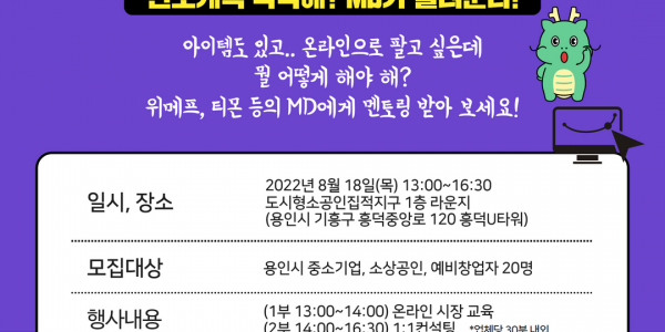 용인시산업진흥원(원장 김윤석, 이하 진흥원)은 용인 기업과 소상공인의 온라인 시장 진출 역량 강화를 위한 ‘MD 멘토링 데이’에 참여할 관내 중소기업·소상공인·예비창업자 등을 오는 11일(목)까지 모집한다. ‘MD 멘토링 데이’는 온라인 유통사(위메프·티몬) MD가 참여하여 관내…