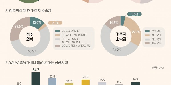 용인시민 10명 가운데 8명은 자신의 사회적 계층을 ‘중층’ 이상이라고 생각하고 있는 것으로 조사됐다. 또, 다른 지역에서 이주해 온 시민을 포함 68.5%는 용인을 고향처럼 여기고 있으며, 10년 후에도 용인시에 거주할 의향이 있다고 응답한 사람은 54.5%로 나타났다. 용…