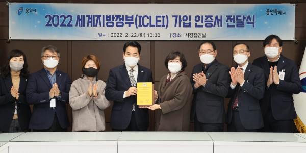 용인시가 22일 친환경 생태도시의 국제적 위상 확보를 위해 추진해 온 이클레이(ICLEI, 세계지방정부협의회) 공식 가입 인증서를 전달받고 정식 회원으로 활동을 시작한다. 이날 시장실에서 열린 인증서 전달식에는 백군기 용인시장, 박연희 이클레이 한국사무소장, 손봉희 이클레이 한국사…