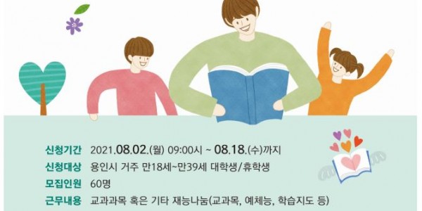 용인시는 8월2일부터 18일까지 관내 초등학교 돌봄교실이나 지역아동센터 등에서 학습도우미로 재능 나눔할 관내 대학생 60명을 모집한다. 코로나19 위기로 온라인 수업을 하면서 학습격차가 벌어진 돌봄 아동들의 학습지도를 돕고 청년들에겐 일자리를 지원하기 위해서다. 대상은 관내 …