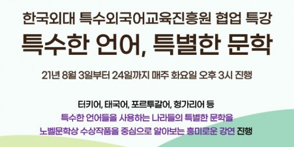 용인시 도서관이 다음달 3일부터 28일까지 온라인 인문학 강연 ‘특수한 언어, 특별한 문학’을 운영한다. 한국외국어대학교 특수외국어교육진흥원과 협업해 마련한 이번 강연에서는 평소 쉽게 접할 수 없었던 터키어, 태국어, 포르투갈어, 헝가리어 등 특수외국어지역의 언어로 구현된 노벨문학…