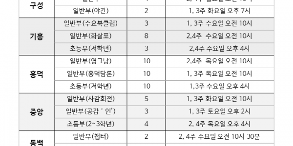 용인시는 독서토론과 독후활동 등을 하는 온라인 독서동아리에 참여할 회원 107명을 8일~18일 모집한다. 시민들이 독서하는 책을 읽고 토론까지 하면서 다양한 소양을 넓히도록 하려는 것이다. 대상 도서관은 구성・기흥・흥덕・중앙・동백・모현・보라・남사 등 8곳이다. 한 동아리당 1…