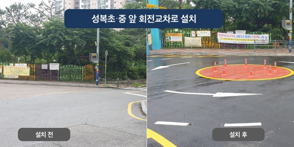 용인시 수지구는 7일 학생들의 안전을 위해 성복동 성복초‧중학교 교문 앞에 회전교차로를 설치했다고 밝혔다. 두 학교가 인접해 많은 학생들과 차량이 통행하는 구간임에도 차량 회차공간이 협소해 정체는 물론 통행 안전에도 문제가 많았기 때문이다. 학교측은 지난 5월 백군기 용인시장…