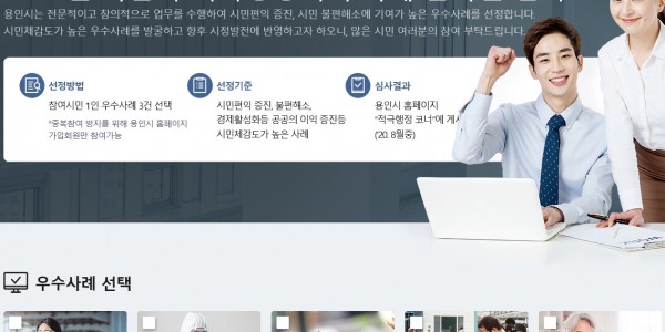 용인시는 27일 ‘코로나19 대응 적극행정 우수사례’ 온라인 시민평가를 통해 5건의 우수사례를 선정했다고 밝혔다. 이를 위해 시는 코로나19 관련 우수 행정 사례 21선 가운데 시 적극행정지원위원회 심의 등을 통해 10건을 선정한 후 지난달 27일부터 8월7일까지 2주간 시 홈페이…
