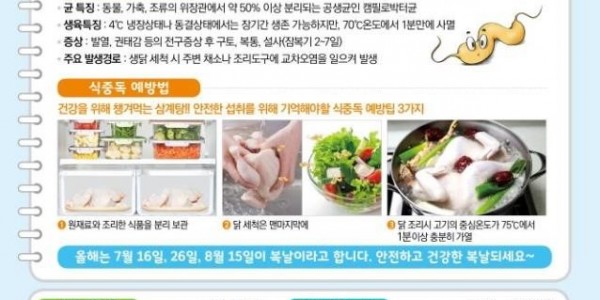 용인시보건소는 26일과 8월15일 복날을 맞아 생닭을 취급 ‧ 조리할 땐 캠필로박터 식중독 예방을 위해 각별한 주의가 필요하다고 밝혔다. 캠필로박터균은 동물이나 가축, 조류의 위장관에서 흔히 발견되는 균으로 동물에서 사람으로 전염되어 인수공통감염병을 일으킬 수 있다. 냉장이나…