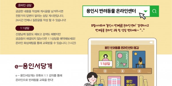 용인시는 올바른 반려문화를 조성하기 위해 반려동물 교육과 상담 등을 통합 지원하는 온라인 센터를 6월부터 운영한다고 밝혔다. 이를 위해 시는 ‘동물과의 행복한 교감’이라는 이름으로 센터 홈페이지(http://yongincenter.com)를 개설했다. 홈페이지엔 반려동물에 관…