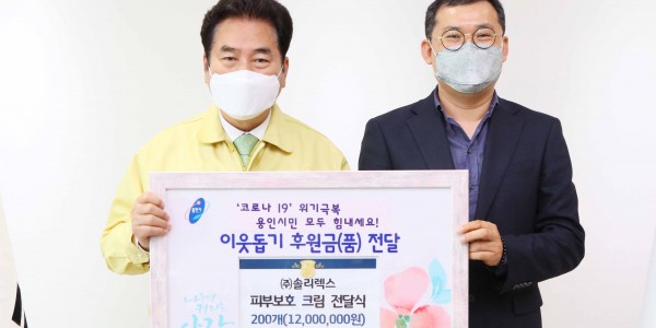 (재)용인시지원봉사센터는 12일 ㈜솔리렉스 이종성 대표 등 관계자 5명이 백군기 시장실을 방문해 관내 환경미화원을 위해 써 달라며 기능성 피부보호 크림 200개(1200만원상당)를 기탁했다고 밝혔다. 이종성 ㈜솔리렉스대표는 “폐기물을 처리하는 미화원들이 오염 물질에 노출되는 빈도가…