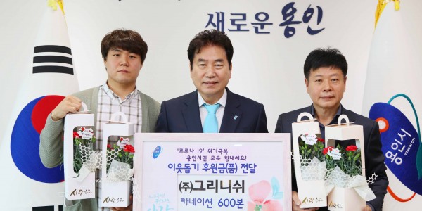 용인시는 7일 처인구 남사면 화훼업체 그리니쉬농업회사법인의 권영석 대표 등 관계자들이 백군기 시장실을 방문해 600만원 상당의 카네이션 600본을 기탁했다고 밝혔다. 권 대표는 “코로나19로 외부활동을 자제하면서 답답함을 호소하는 어르신들이 화사한 꽃을 보며 조금이나마 위안을 얻기…