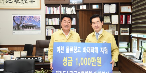 경기도시장·군수협의회 안병용 협의회장(의정부시장)은 5월 1일 오후 이천시청을 방문해 엄태준 이천시장을 만나 물류창고 화재와 관련하여 위로의 뜻을 전하고 성금 500만 원을 전달했다. 협의회 성금과는 별도로 의정부시에서도 성금 500만 원을 지원했다. □ 안병용 협의회장은 “먼저 …