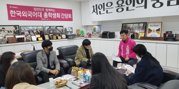 미래통합당 용인갑 국회의원 후보인 정찬민 전 용인시장은 7일 오후 캠프 사무실에서 한국외국어대학교 글로벌캠퍼스 총학생회 회장 및 단과대 학생회장 8명과 간담회를 가졌다고 밝혔다. 이날 간담회에서 외대 박상원 총학생회 회장은 ▲모현지역의 교통시설 증대 ▲모현주변 인프라 개발 ▲CCT…