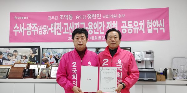 ‘용인·광주 전 시장출신이 전철유치를 위해 뭉쳤다.’ 전 시장출신으로 총선에 출마한 미래통합당 정찬민 용인갑 후보와 조억동 광주갑 후보는 31일 처인구에 있는 정 후보 선거사무실에서 공동으로 전철유치를 추진하는 협약식을 가졌다고 밝혔다. 이날 두 후보는 서로 접해 있는 용인…