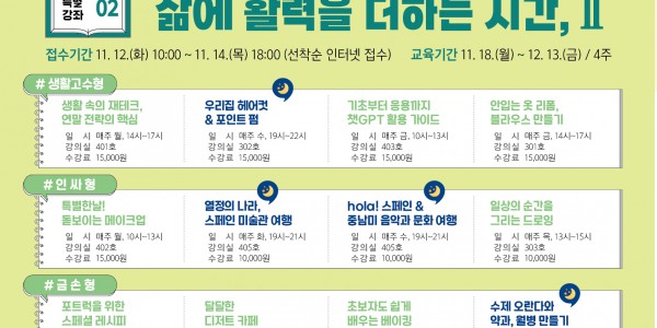 용인특례시(시장 이상일)는 평생학습관(수지)이 ‘삶의 활력을 더하는 시간, Ⅱ’를 주제로 마련한 특별강좌 수강생을 모집한다고 12일 밝혔다. 시는 ▲ ‘생활 고수형’ (생활 속의 재테크 연말 전략 핵심, 우리집 헤어컷& 포인트 펌, 기초부터 응용까지 챗 GPT 활용 가이드, 안 입…