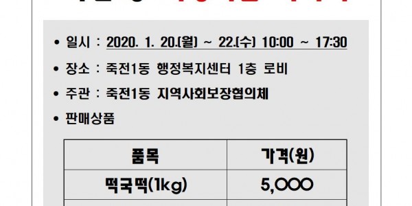 용인시 수지구 죽전1동은 지역사회보장협의체가 어려운 이웃을 돕기 위해 20~22일 행정복지센터 로비에서 ‘사랑나눔 바자회’를 연다고 밝혔다. 이날 바자회에선 설 명절을 앞두고 떡국떡, 가래떡, 참·들기름, 한과 등을 판매할 예정으이다. 수익금은 전액 관내 어려운 이웃을 돕는 곳에 …
