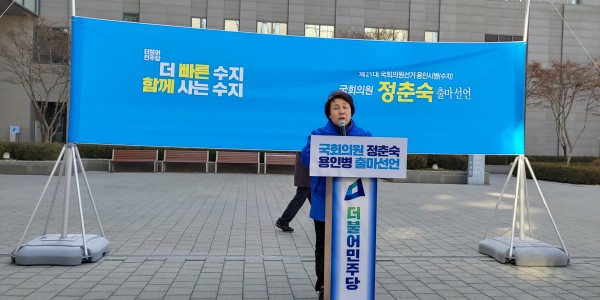 1월 18일 현역출신 정춘숙 더불어민주당용인(병) 국회의원이 수지 구청에서 200여명의 내빈들을 초청한 가운데 4월에 있을 총선에 대비하여 출마할 뜻을 밝혔다. 꿈이 있고 희망이 넘치는 내 고장 수지를 만들어 가기 위해서 금뱃지만 달고 행세한다고 자연히 이루어지는 것은 아니다. …