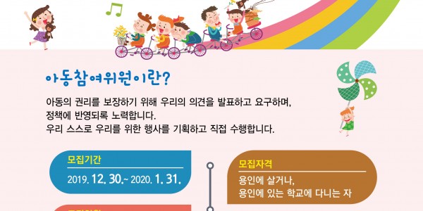 용인시는 아동 스스로 주체가 되어 권리 증진을 위한 정책을 제안하고 행사에 참여하는 등의 활동을 할 아동참여위원회 위원 22명을 31일까지 모집한다. 시에 거주하거나 관내 학교에 재학 중인 11세이상 18세이하(초등4학년~고등2학년) 아동‧청소년이라면 누구나 참여할 수 있다. …