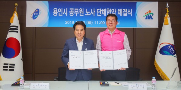 용인시는 15일 시청 시장실에서 용인시공무원노동조합과 최초의 노사 단체협약을 맺었다. 이 자리엔 백군기 용인시장과 강윤균 노조위원장을 비롯한 노사 양측 교섭위원 20여명이 참석했다. 이날 양측은 근무조건 개선과 후생 복지 제고, 조직 및 인사제도 개선 등의 내용을 담은 120…