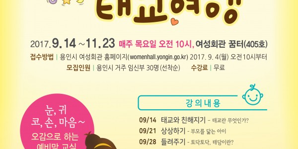 용인시는 임산부들이 오감활동을 통해 태아와 친밀감을 형성하고 부모가 될 준비를 할 수 있도록 돕는 ‘오감태교여행’ 강좌를 개설해 다음달 4일부터 선착순으로 수강생을 모집한다고 밝혔다. 강좌는 다음달 14일부터 11월 23일까지 총 10주간 진행되며 상상하기, 들려주기, 돌아보기, …