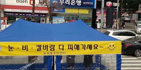 용인시 기흥구 보정동은 보행자 유동인구가 많은 주민센터앞과 카페거리 사거리 앞 등 횡단보도 2곳에 겨울철 차가운 바람을 피할 수 있는 바람막이 텐트를 설치했다고 밝혔다. 신호를 대기하는 시민들이 바람이나 눈, 비를 피할 수 있도록 동 주민센터의 공공비품인 텐트를 사용해 쉼터를 마…