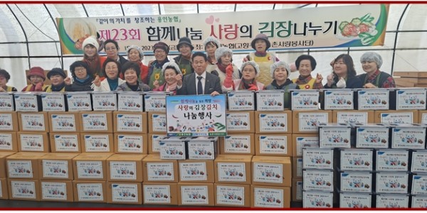 용인농협(조합장 김상용) 임직원은 지난 11월 17일에 용인시 고향주부모임(고향을 사랑하는 주부들 모임), 용인농협농촌사랑봉사단 등과 함께 송문리 절임배추농장에서 11월 16일부터 준비해온 ‘제23회 함께나눔 사랑의 김장김치 나누기’ 행사를 진행했다. 김장나누기 행사에서는 지…