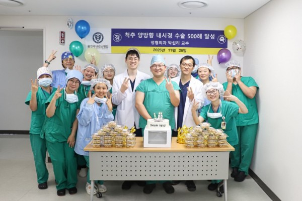 연세대학교 용인세브란스병원(병원장 김은경)은 26일 3층 수술실 회의실에서 정형외과 박섭리 교수의 양방향 척추 내시경 수술 500례 달성 기념 행사를 개최했다. 양방향 척추 내시경 수술은 척추관 협착증 치료 시 병변 부위에 1cm 이하의 작은 절개 두 개를 내어 내시경 카메라 및 수술기구를 삽입해 수술하는 최소 침습 수술법이다. 기존에 시행하던 방법과 비교해 피부 절개 부위가 작고, 수술 후 회복이 빠르다는 장점이 있다.…