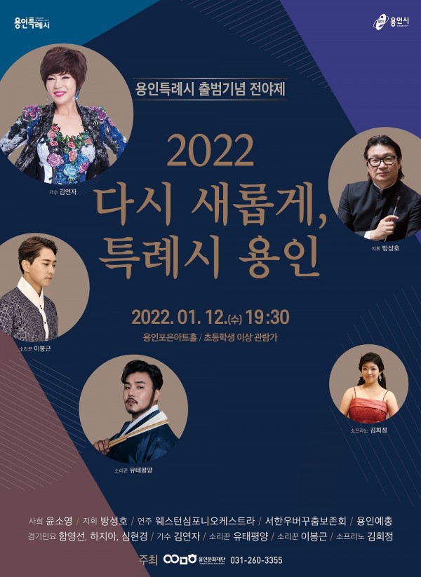 용인문화재단(이사장 백군기)이 용인특례시 출범을 기념하여 전야제인 ‘다시 새롭게, 특례시 용인’ 을 오는 12일 저녁 7시 30분 용인포은아트홀에서 개최한다. 국악과 클래식이 함께하는 이번 공연은 지역예술단체 서한우버꾸춤보존회의 복을 기원하는 ‘문굿’ 공연을 시작으로, ‘뱃노래’, ‘자진뱃노래’ 등 경기민요 공연과 용인문화재단 상주단체 웨스턴심포니오케스트라(지휘자 방성호)의 연주를 선보인다. 또한, 소프라노 김희정이…