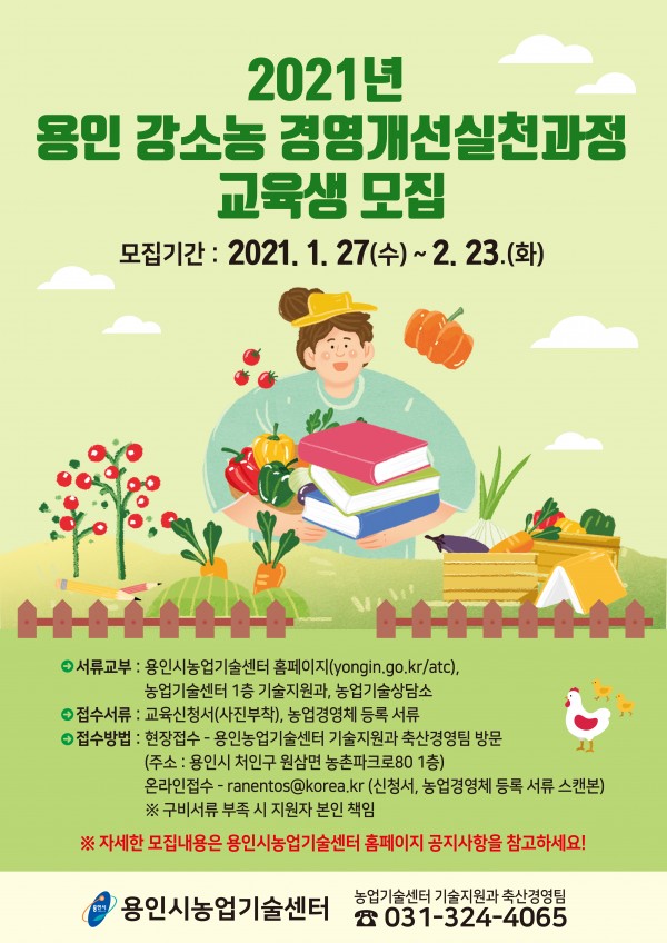 용인시는 농업인들의 경쟁력을 강화하기 위한 ‘강소농 경영개선실천 교육’에 참여할 농업인 30명을 2월 23일까지 모집한다. 농업경쟁력을 강화하기 위한 현장 컨설팅을 비롯해 회계, 마케팅 활성화 방안 등 농업 전반에 대한 교육을 진행한다. 모집 대상은 용인시에 주소를 둔 가족농이나 귀농인 등 경영전략 수립을 원하는 농업인이다. 오는 3월부터 10월까지 비대면 화상교육과 대면 교육을 병행한다. 시에서 수강료와 교재…