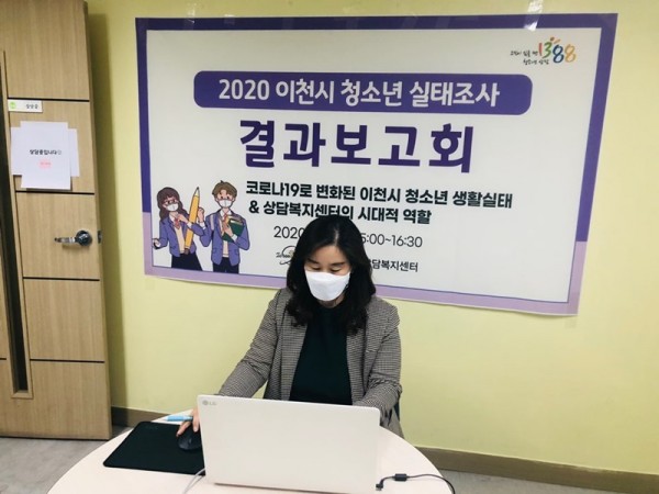 (재)이천시청소년재단 이천시청소년상담복지센터에서는 금일(22일) 코로나19 장기화에 따른 이천시 청소년들의 일상생활 변화에 대한 실태조사를 실시하고, 실태조사 연구결과를 기반으로 ‘청소년상담복지센터의 시대적 역할의 방향성’을 제시하고자 온라인 결과보고회를 개최하였다.▲온라인 결과보고회 행사 진행 사진(김유정 센터장)이번 온라인 실태조사 결과보고회는 당초 예정되었던 대면 행사에서 코로나19 방역단계 격상에 따라 화상회…