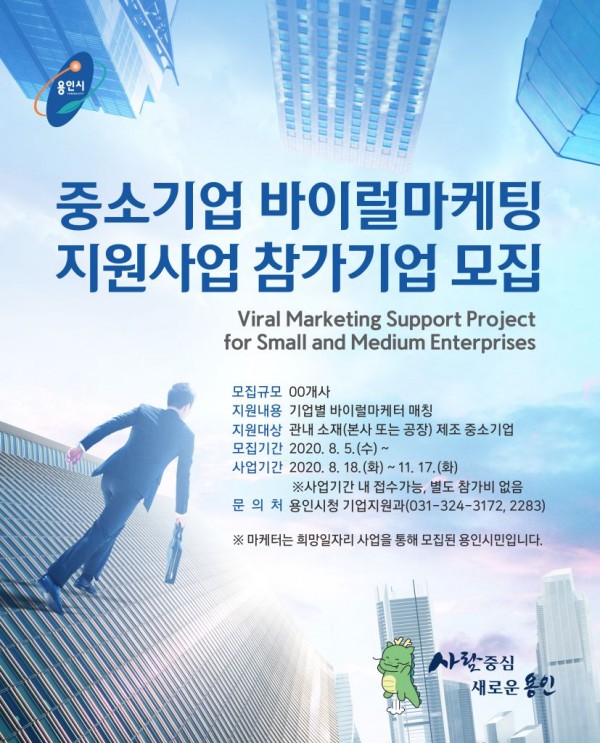 용인시는 7일 블로그나 SNS 등 온라인에서 회사와 제품을 알리는 바이럴 마케팅을 지원받을 관내 중소기업을 14일까지 모집한다고 밝혔다. 코로나19로 위기를 겪는 관내 제조 중소기업이 판로를 개척하도록 돕기 위해서다. 대상은 관내 본사나 공장을 둔 제조 중조기업이다. 신청을 하려면 시 홈페이지에서 신청서를 다운받아 시 기업지원과로 우편이나 이메일(lemonade0302@korea.kr)로 접수하면 된다. 참여 …