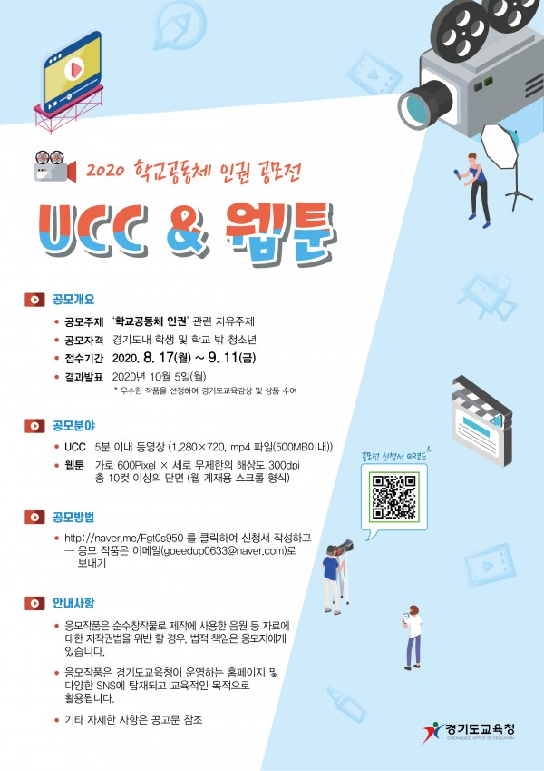 경기도교육청(교육감 이재정)이 경기도 학생인권 조례 제정 10주년을 맞아 학교공동체 인권 UCC · 웹툰 공모전을 한다. 응모 대상자는 경기 초·중·고등학생과 학교 밖 청소년이다. 응모를 원하는 청소년은 이달 17일부터 다음 달 11일까지 웹 주소(http://naver.me/Fgt0s950)에 접속해 신청서를 작성하고 작품은 이메일(goeedup0633@naver.com)로 제출하면 된다. 응모 작품은 학교공동체 인…