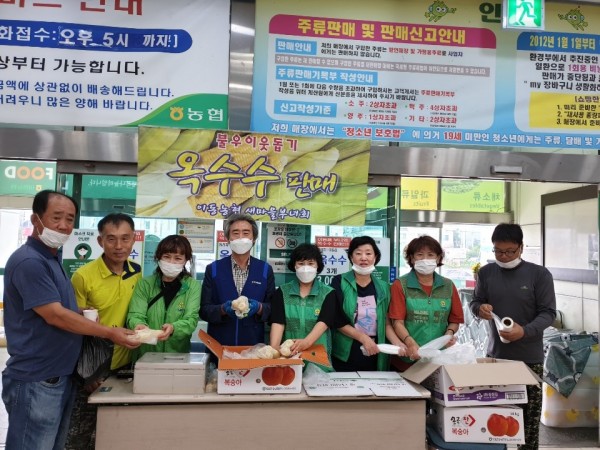 이동읍새마을지도자(부녀회장 이진숙)는 이동농협 하나로마트 내에서 7월 10일에서 24일까지 15일간 찐 옥수수 판매를 하였다. 이동읍새마을지도자(부녀회장 이진숙)는 지역 농가에서 일반시장보다 높은 가격에 아침에 수확한 옥수수를 납품받아 판매 하다 보니 맛이 좋아 인기도 많다며, 해마다 잊지 않고 찾아주시는 손님과 판매사업을 할 수 있도록 자리를 제공해 주신 이동농협 하나로마트(지점장 강춘구)와 이동읍새마을부녀회 회원들의 …