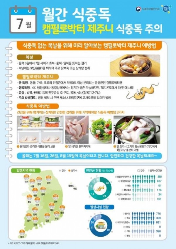 용인시보건소는 26일과 8월15일 복날을 맞아 생닭을 취급 ‧ 조리할 땐 캠필로박터 식중독 예방을 위해 각별한 주의가 필요하다고 밝혔다. 캠필로박터균은 동물이나 가축, 조류의 위장관에서 흔히 발견되는 균으로 동물에서 사람으로 전염되어 인수공통감염병을 일으킬 수 있다. 냉장이나 동결상태에서는 장기간 생존 가능하지만, 70℃ 이상의 고온에서는 1분 만에 사멸한다. 이와 관련해 보건소는 캠필로박터균 식중독을 예방하기…