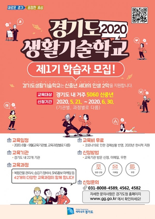 경기도가 도내 중장년층에게 생활기술교육을 무상으로 제공하는 ‘경기도생활기술학교’ 교육생을 모집한다.도는 2017년부터 도내 5060 신중년 세대의 근로를 통한 경제적 노후준비 및 지속적 사회 참여 기회 제공을 위해 소양교육, 생활기술교육, 사회봉사연계 현장실습, 취·창업을 지원하는 ‘경기도생활기술학교’를 운영하고 있다.2020년 경기도생활기술학교 교육기관으로는 가천대, 청강문화산업대, 대진대 등 22개 평생교육기관이 공모를 통…