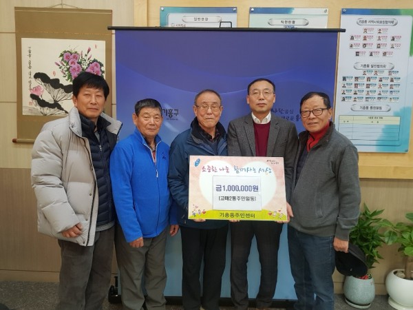 용인시 기흥구 기흥동은 23일 고매2통 주민들이 이웃돕기 모금 운동인 사랑의 열차를 통해 성금 100만원을 기탁했다고 밝혔다. 이날 김진린 고매2통장은 “어려운 이웃에게 작게나마 도움을 주고 싶은 마음에 주민들이 십시일반 정성을 모았으며 이 성금이 이웃에게 따뜻한 위로가 되길 바란다”고 말했다. 동은 이 성금을 경기사회복지공동모금회를 통해 관내 생계가 어려운 이웃을 돕는 데 사용할 방침이다.