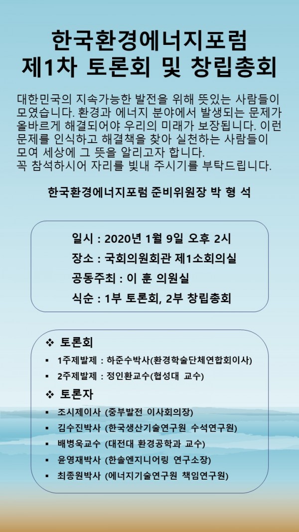 한국환경에너지포럼(이하 포럼)이 오는 9일 오후2시 국회의원회관 제1소회의실에서 더불어민주당 이훈 의원실과 함께 토론회를 개최하며, 공식적으로 첫발을 내딛는다. 포럼은 환경과 에너지문제의 중요성을 인식한 관련 인사들이 모여 구성한 단체이다. 박형석 준비위원장의 주도로 지난해 10월 29일 30명의 발기인이 모여 발기인 대회를 개최했다. 발기인은 환경과 에너지 분야의 공공기관, 연구기관, 기업 관계자 등 전문가 집단으로 구…